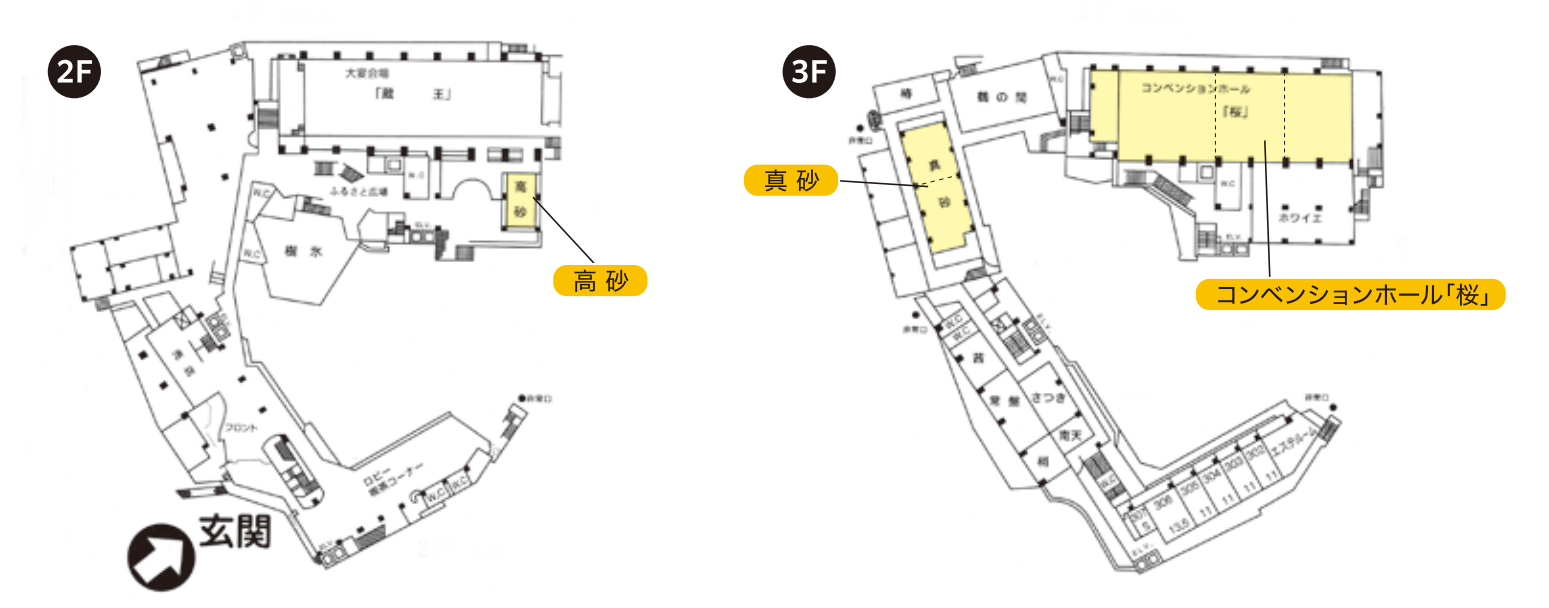 | コンベンションホール「桜」 | 600 | 450 | 160 | 300 | 450 | 4m | 3分割 | 有(Wi-Fi) | 可 | ||