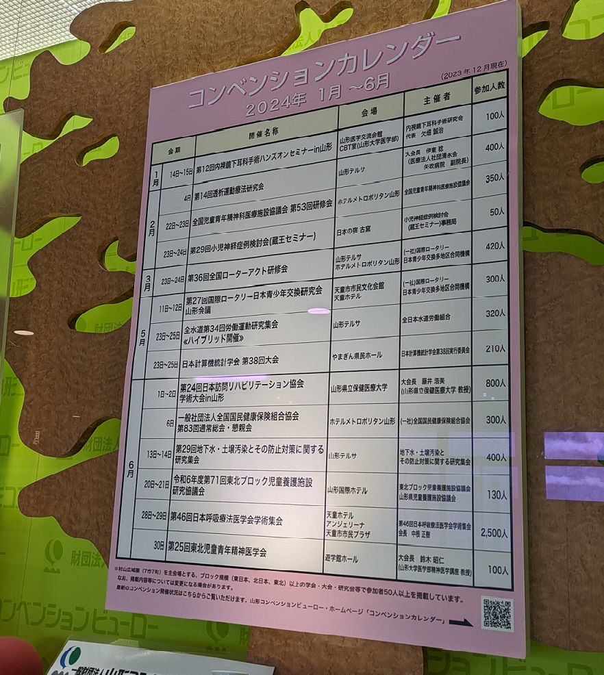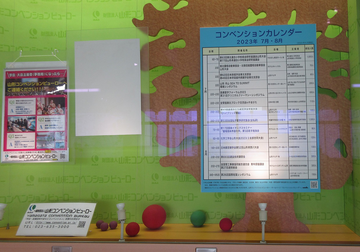 山形コンベンションビューローでは、JR山形駅東西自由通路アピカ内ショーケースにコンベンションカレンダーを掲示し、市民の皆様にコンベンションの開催予定をお知らせしております。