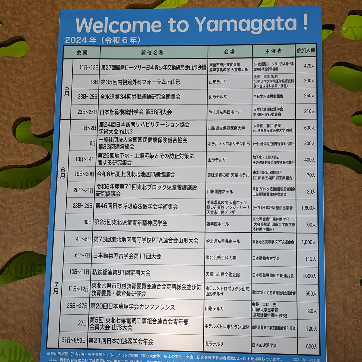 本日、最新版のコンベンションカレンダー2024年5月~7月を掲示いたしました。JR山形駅へお立ち寄りの際には是非ご覧ください。