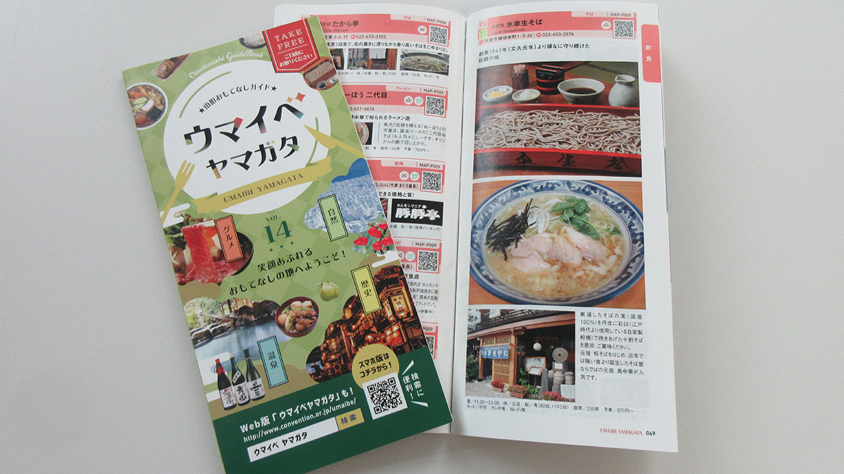 この度、山形おもてなしガイド「ウマイベヤマガタ」VOL.14が完成しました。ウマイベヤマガタは、山形の飲食店や土産店、観光レジャー、宿泊、交通などの各種情報が掲載されたガイドブックで、山形で開催するコンベンション参加者に無料で提供しています。