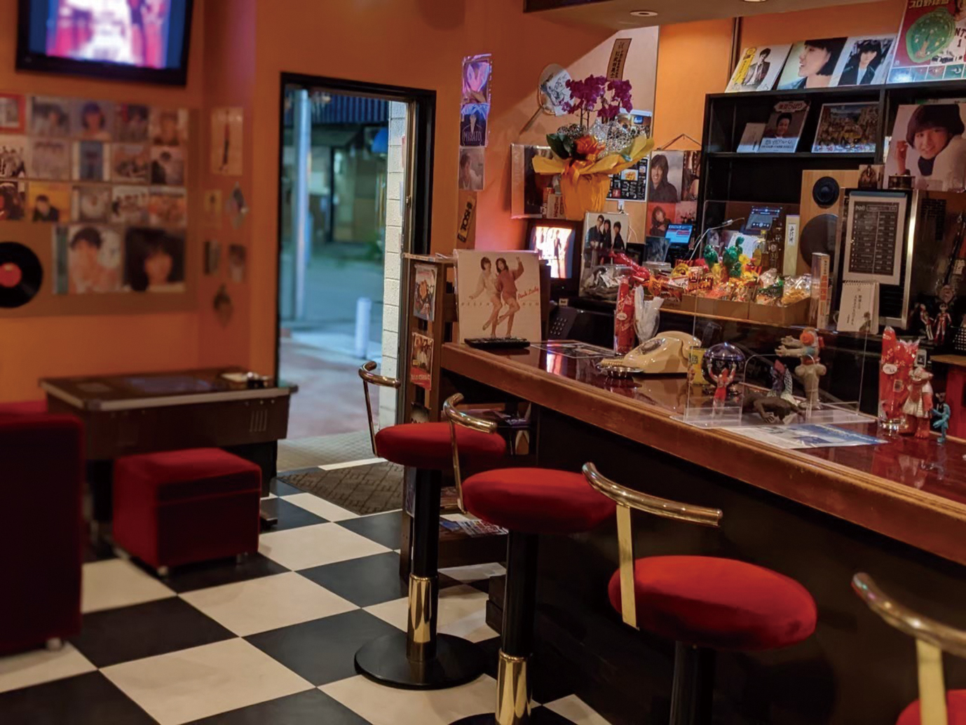 This much talked about bar stocks around 2,000 pop records, magazines such as Myojo and Heibon, various photo books, Invader games, and other retro Showa era goods.